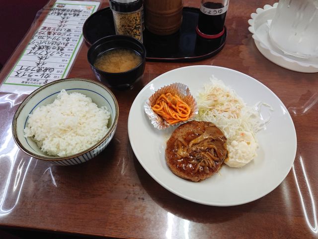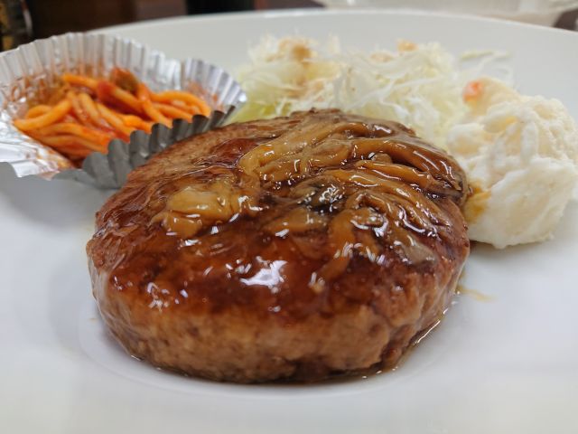 今日のメインはまいたけハンバーグ、舞茸が沢山のっていますね^^; 舞茸と一体になったソースは適度に濃厚でハンバーグをワンランクレベルアップさせてくれます。手作り感あるポテサラとスパゲッティも美味しかったです!