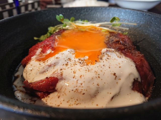 ソースはローストガーリックを選択、豪快に頂きましょう。ローストビーフは薄いですが何枚もあって層が厚い印象、どこを頂いても肉の旨味がしっかりです。ガーリックもしっかりですがクリームソースが中和して全体的には上品味わい、ご飯量も多くお腹が膨らみました^^