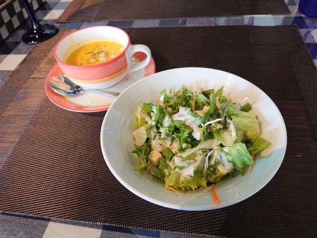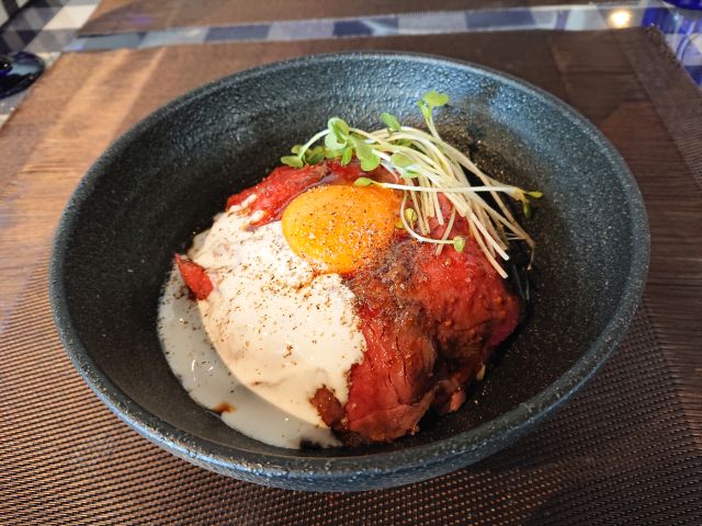 注文はローストビーフ丼、最初にサラダとスープが運ばれてきます。スープはかぼちゃのポタージュ、濃厚な味わいで美味しいですね。暫くしてローストビーフ丼もやって来ます、赤・黄・白・緑の配色が綺麗です。