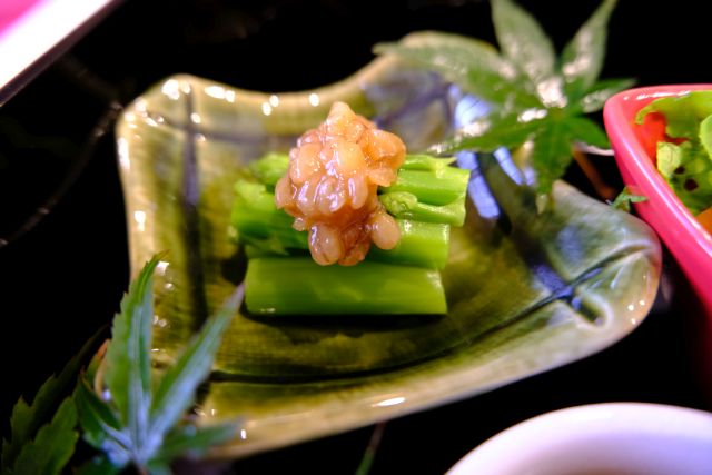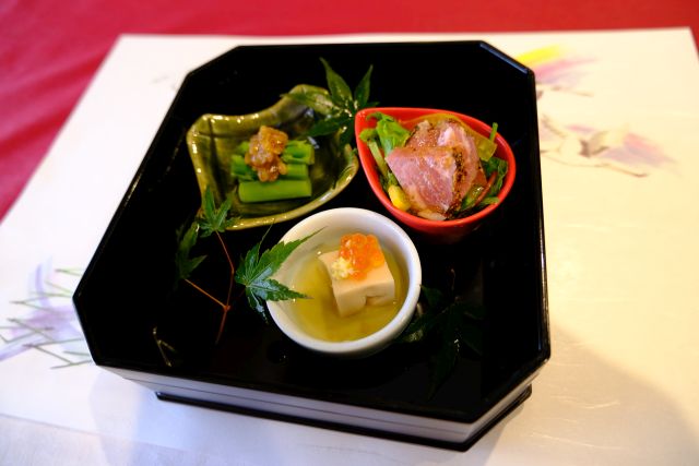 前菜からスタート、ごま豆腐・豚のタンスモーク・井原産アスパラガス、どれも繊細な味わいですね、酒が欲しくなります^^ 旨味のしっかりあるタンの燻製仕様は美味いですね。