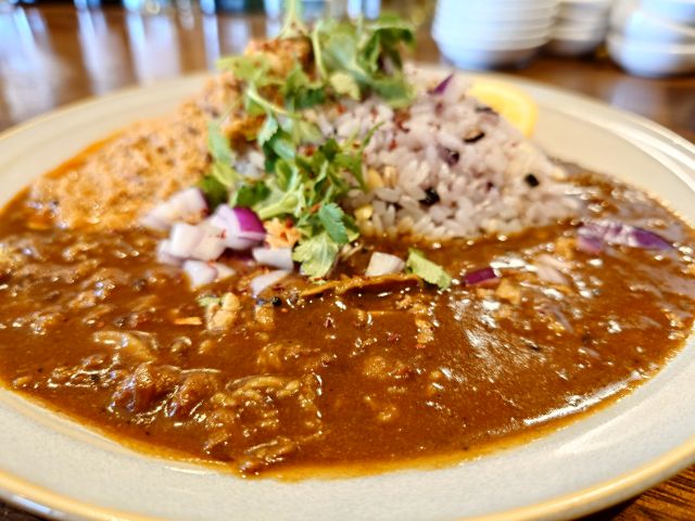 注文は「2種あいがけ(1400円)」、待つこと10分少々で着皿、雑穀米の上にはパクチー、裾には辣韮・檸檬が添えられています!!
