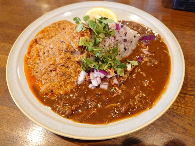 右側はハヤシライス、スパイスカレーベースなので見た目ハヤシですが食べるとコクのあるカレーですね、トマトの酸味や玉ねぎの甘さはあまり感じられません。左側のキーマカレーは豚&鶏ミンチのダブル仕様、やげん軟骨も入って凝ったカレーですね、こちらもスパイスしっかりで肉肉しい味わい、最後まで美味しく頂きました(*^^*)
