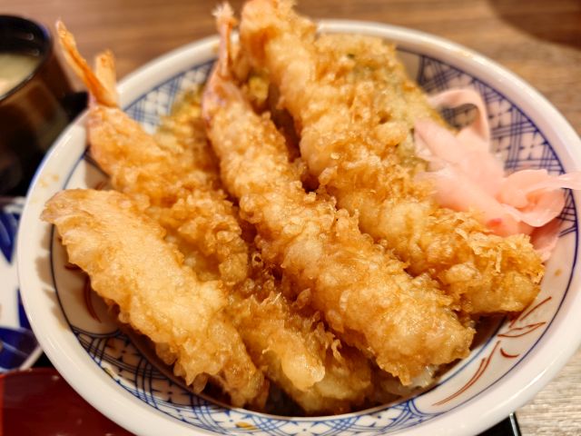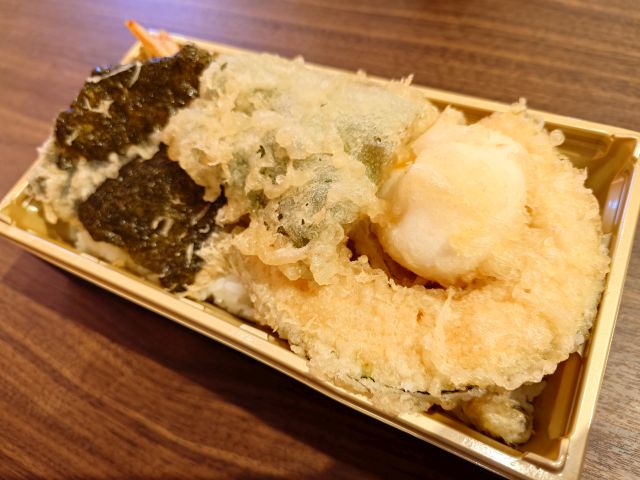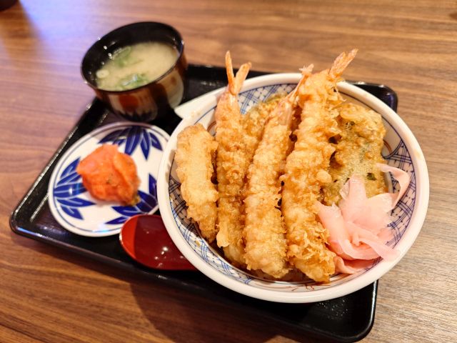 揚げ立てですが天種をタレ壺に漬けますので衣はしんなりした状態での提供となします、海老天は中サイズですが3尾あるので食べ応えあります。野菜は大きめ、甘い南瓜とピーマンが好みの味わい、ご飯量は多めなのでめかぶ明太子が進みますね、味噌汁は蜆仕様でした(*^^*)