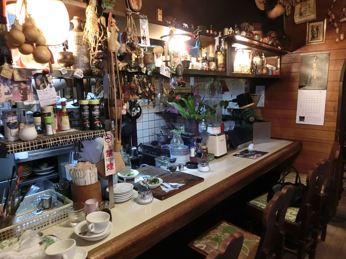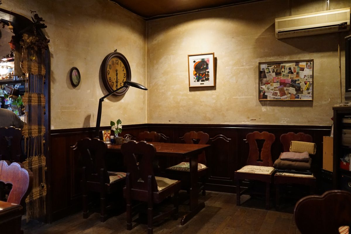 内観は少し薄暗く落ち着いています。入ってすぐの位置にカウンター、奥には天井扇がゆったり回るテーブル席があります。テーブル席には読書用のスタンドが置かれていました。