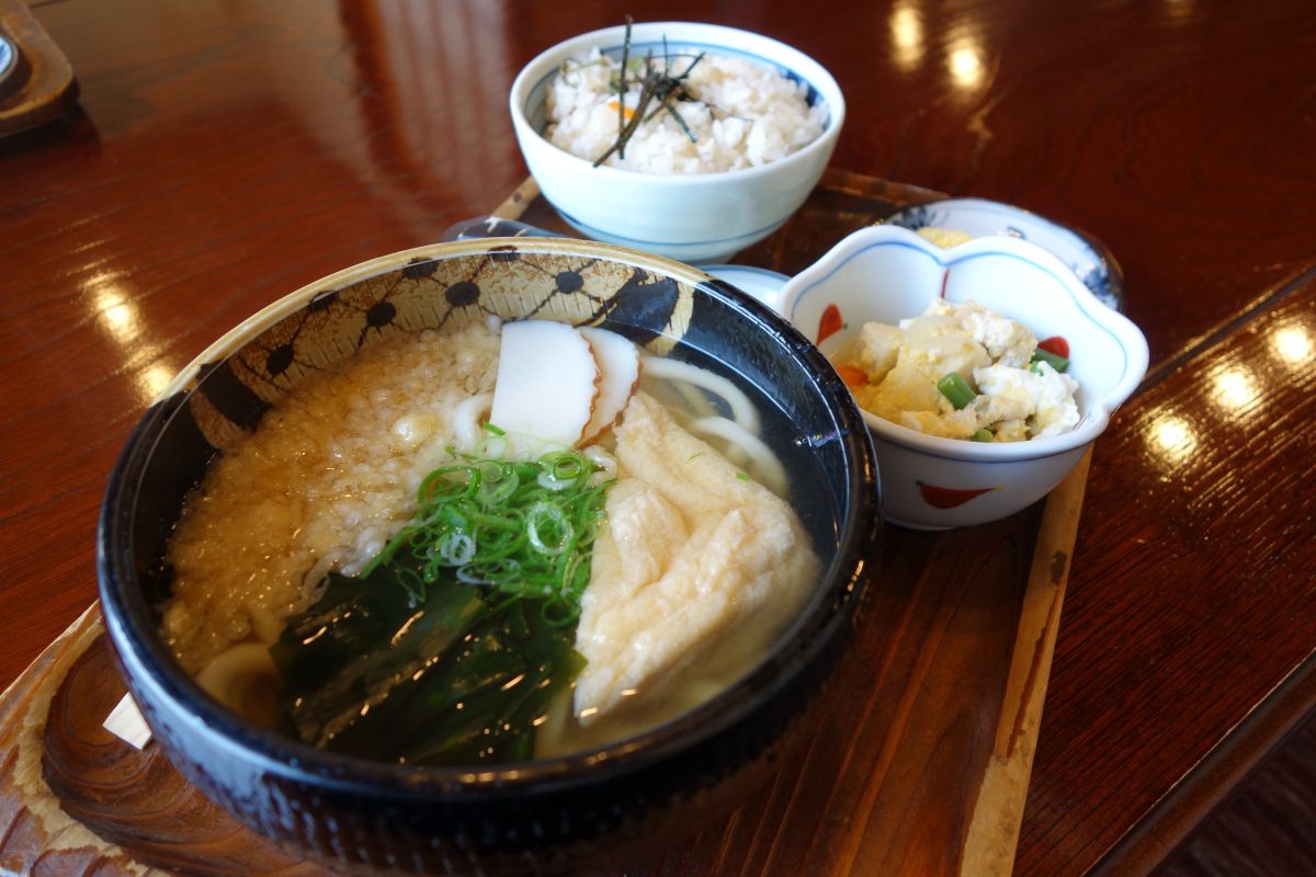 うどん出汁は鰹ベースで濃い目、麺はもっちりでかなり軟らかい独特の食感です、量は多く1.5玉はあると思います。しっかりした味わいの厚い油揚げ・ワカメ・蒲鉾・天カス・青ネギ入りです。炊き込みご飯は薄味具沢山で量がしっかりあります、日替りの小鉢は高野豆腐の和物、炊き込みご飯に合う優しい味付けでした。