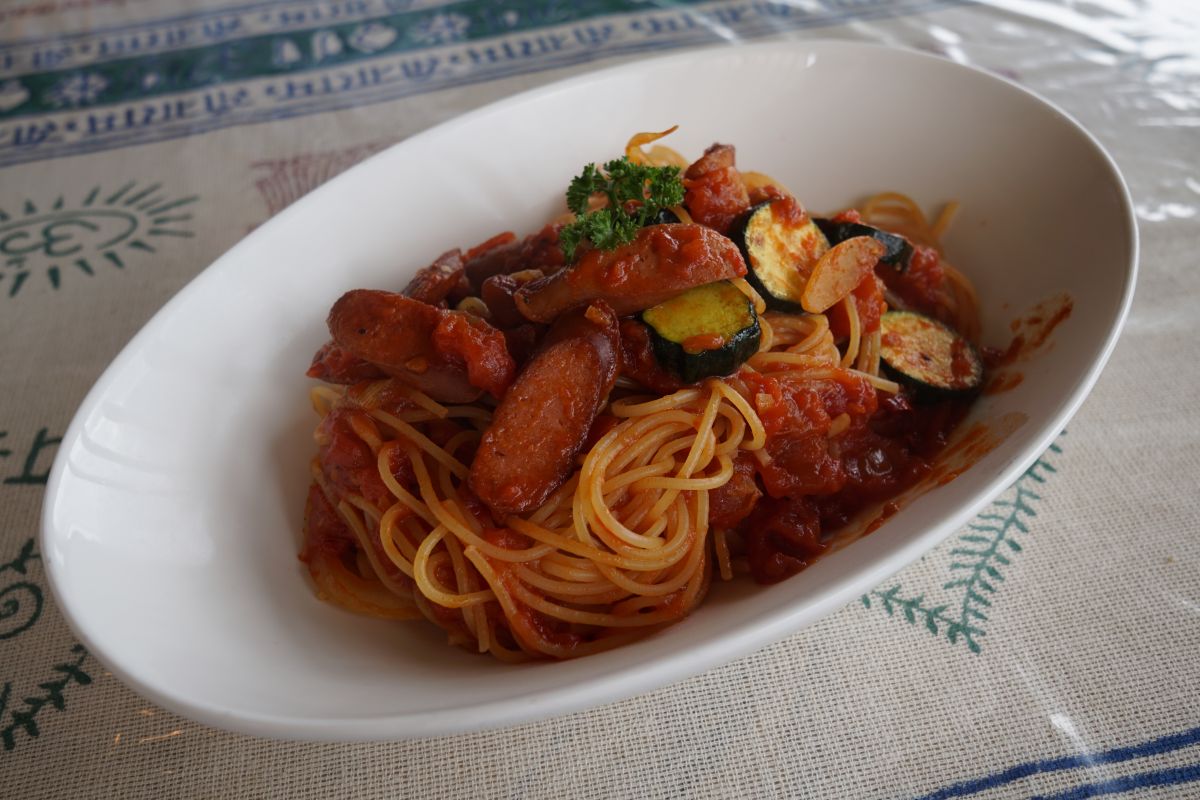 チョリソーピリ辛トマトパスタ、辛めのトマトソースに季節の茄子がしっかり入っています。ねっとりしたソースは昔懐かしい味わいです。パスタ量もしっかりありますので食べ応えありました!
