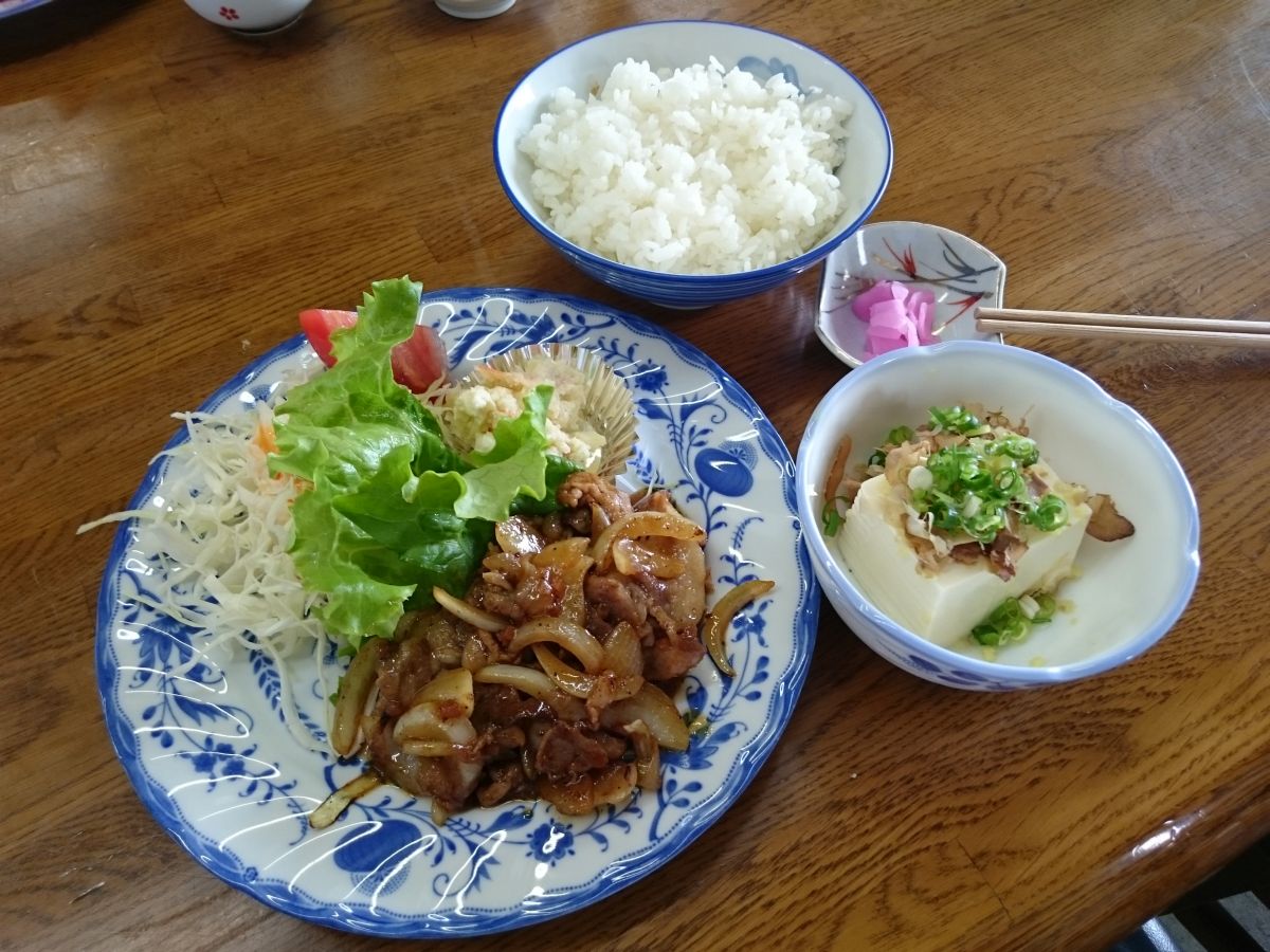 大蒜・生姜の効いた醤油ダレで炒めた豚肉は白飯に合います。奴もこの時期は有難いですね。写真にはありませんが黄ニラ・お麩がしっかり入った熱々味噌汁も美味しかったです^^