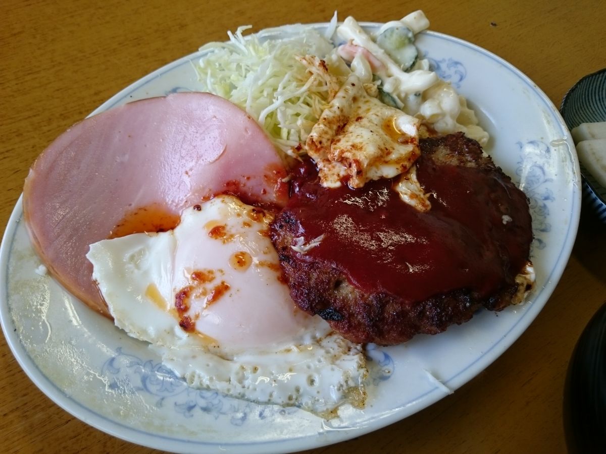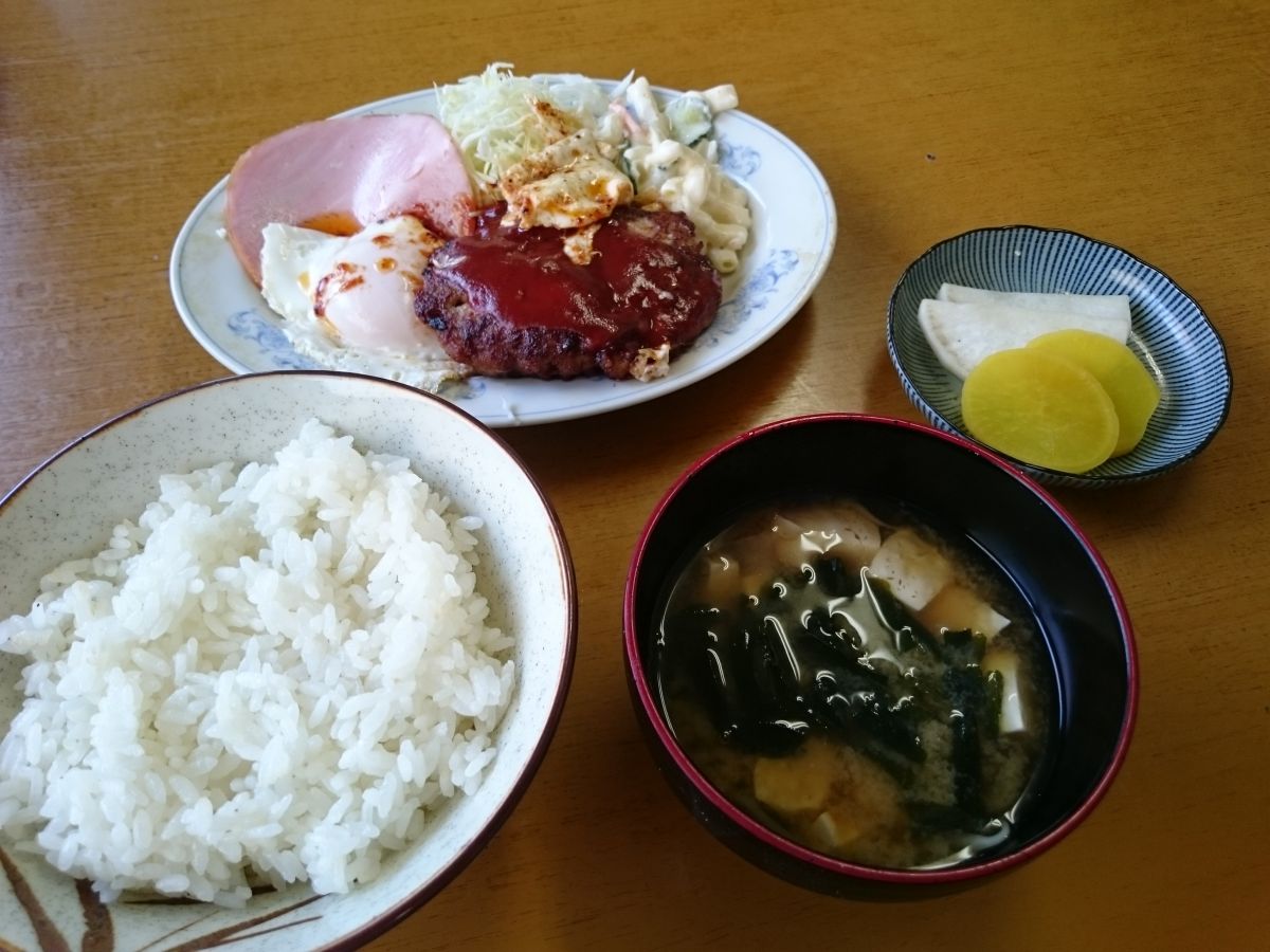 今日はハンバーグ定食(600円)を注文です、待つこと5~6分でやって来ました。手作り感に溢れた美味しそうなハンバーグです、添えられた目玉焼きとハムが嬉しいですね。ハンバーグにはケチャップ系のソースがかかっており味はしっかり濃厚です、家庭的な味わいでご飯が進みます。半熟目玉焼きとハムには醤油を少しかけて頂きます、白飯に合う副菜ですね。味噌汁と漬物もさすがの味付け、昭和食堂さんで美味しくない味噌汁に出会ったことがありません^^