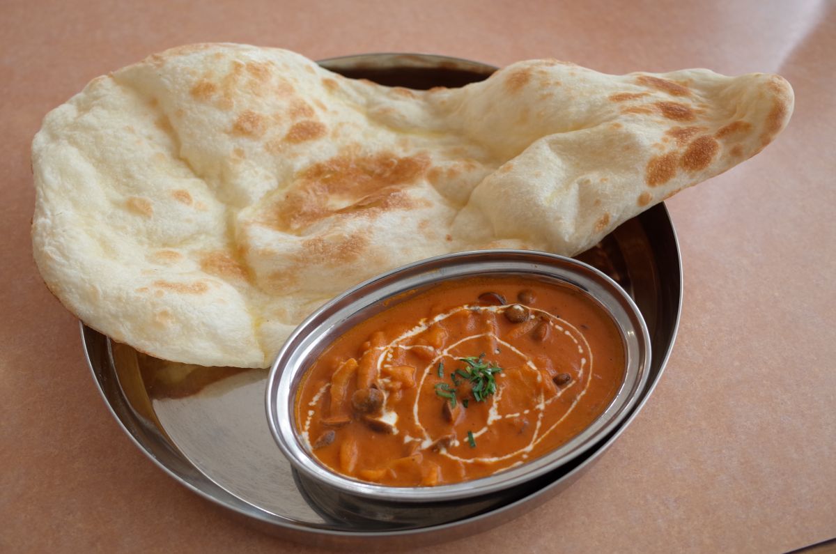 ランチメニューは1000円以下で豊富に揃っています、その中から「タンドリーチキンランチ(790円)」を注文、待つこと5分少々でやって来ました。ナンがデカイですね、もっちり食感で厚みもあります。カレーは日替わりのしめじ&じゃがいも、辛口でお願いしましたがそれほど辛くはなく、テーブルの辛味粉末を投入しました。具材のしめじ・じゃがいものはしっかり入っていました。