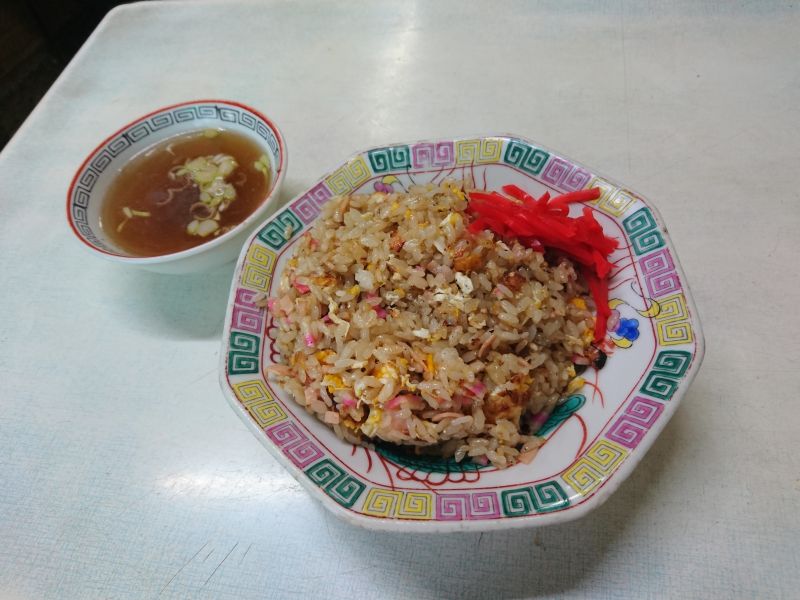中華皿に盛られ雰囲気良いですね、味は醤油ベースでパラパラとしっとりの中間、薄ハム・蒲鉾片が入っていて若干和風チックな味わいです。スープは鶏ガラ、爽やかな味わい、このスープでラーメンが食べたいと思わせる風味です。小鉢も付いていてワンコインとコスパも良好です!
