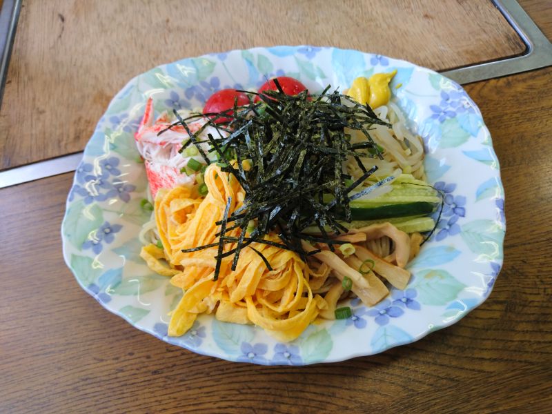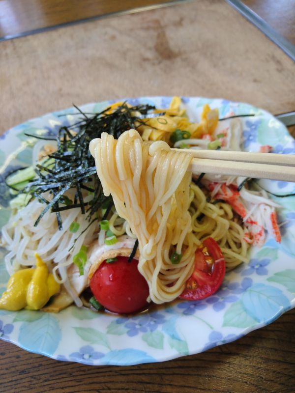 注文は冷麺(550円)、やはり西日本では冷やし中華を冷麺と呼ぶお店が多いです。待つこと6~7分で女将さんが運んで下さいます、具材たっぷりで美味しそうです^^