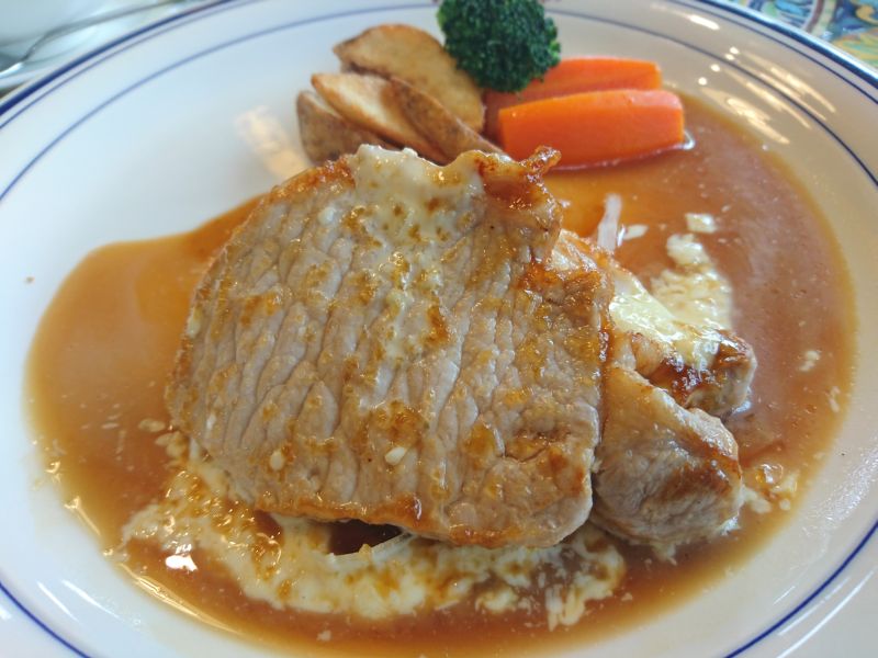 当店は洋食メニューが豊富です、目移りしてしまいましたが基本の日替わりランチ(650円)を注文、待つこと10分弱でやって来ました。今日のメインはポークステーキ、厚みのある中サイズが2枚、適度に濃厚なオリジナルソースがたっぷり掛かっています。甘辛ソースで頂くポークは白ご飯が進みますね^^;
