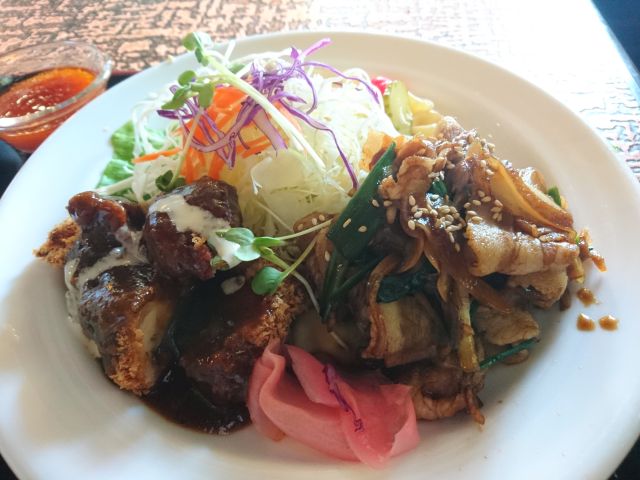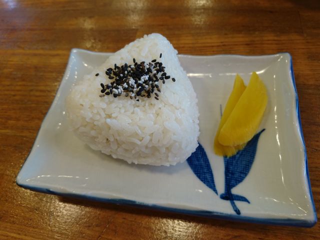おにぎりはかなりでかいですね、上に黒ゴマがしっかりのっています。私は白飯よりおにぎり(orいなり寿司)をいつも選択してしまいます^^;