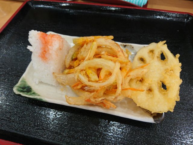 天ぷらは揚げたての時間帯、ころもはサクサクで野菜天・レンコン共に素材の美味さ・甘さがしっかり感じられます。明太子おにぎりも米が美味しく秀逸な仕上がりでした。