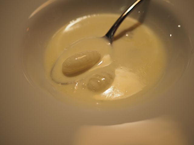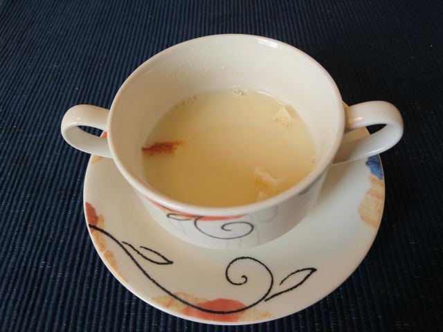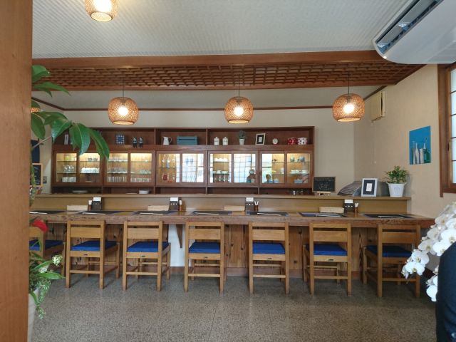 入店するとすぐにうどん種を告げ、天ぷら・おにぎりを取って会計の順番、昼前の時間帯でまだうどんが茹で上がっておらず、てんぷらと&おにぎりだけを貰って、長い横一文字のカウンター席端っこに着きます。かけうどんは5~6分でやって来ました。