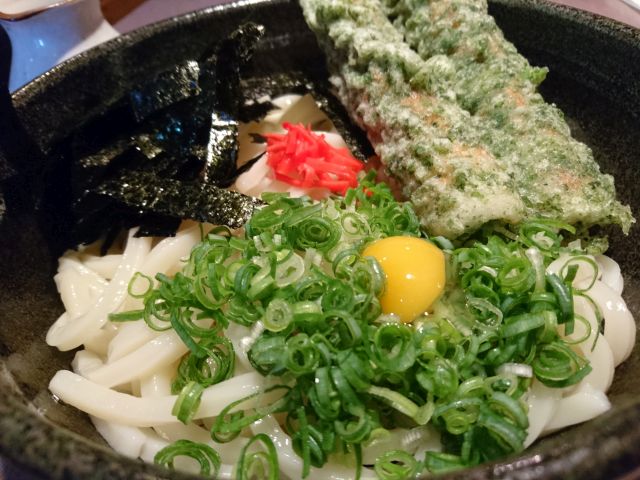 注文は「ちくわ磯辺天ぶっかけ 中(750円)」を冷でお願いしました。待つこと6~7分で着丼、磯辺揚げ海苔と葱の青さが清々しいビジュアルですね!