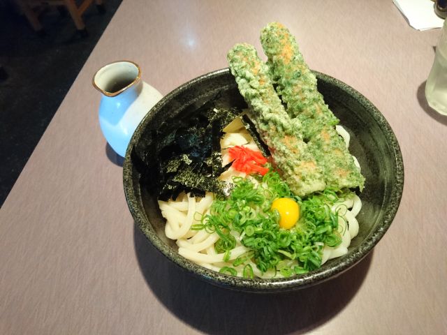 磯辺天はちくわ一本を半分にして揚げています、揚げたてホカホカは盛夏でも嬉しいですね。他の具材は刻み海苔・うずら卵・青ネギ・紅しょうがです。
