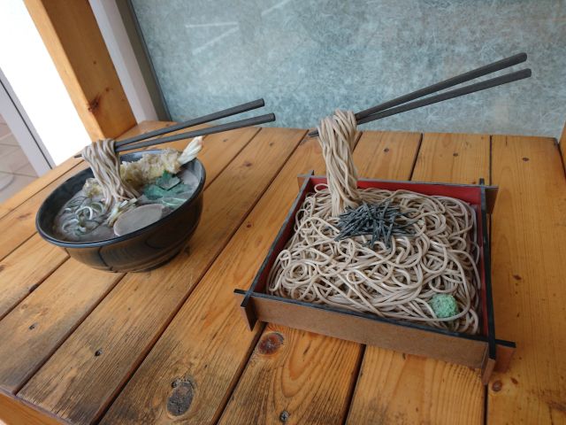 注文は「牛丼ざるそば定食(1300円)」+蕎麦大盛り(300円)、いつもは親子丼を注文するのですが今回は未食の牛丼にチャレンジ。満席なので30分以上かかって配膳です。