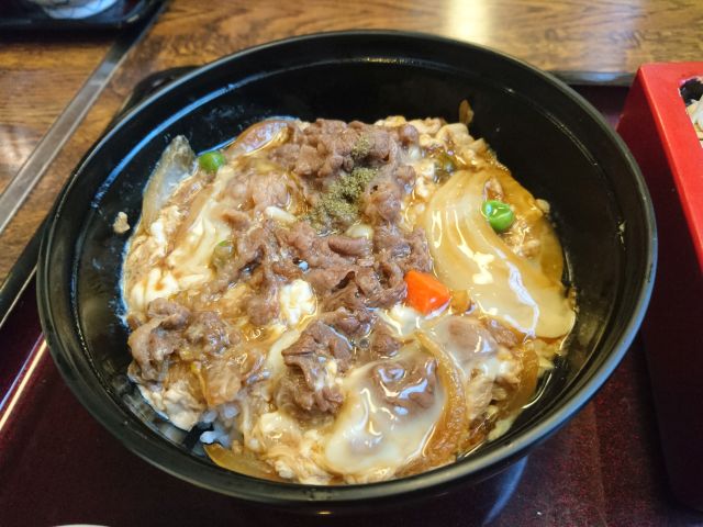牛丼は濃い目の味わいで山椒も効いています。牛肉は脂身少なくあっさり、半熟卵が全体に掛かっておりトロトロ食感...私は親子丼の方が好きかな^^;