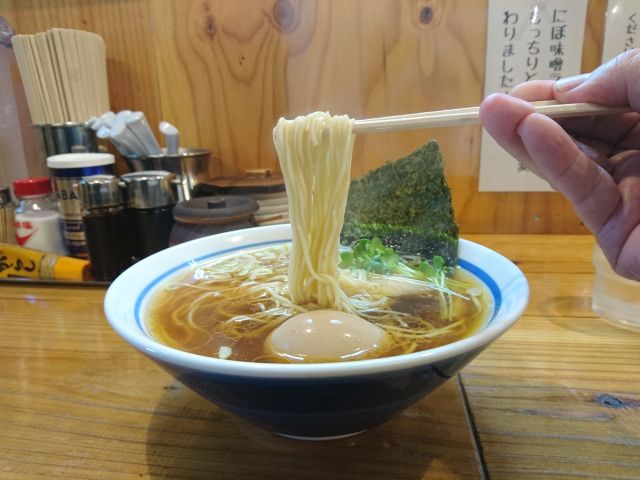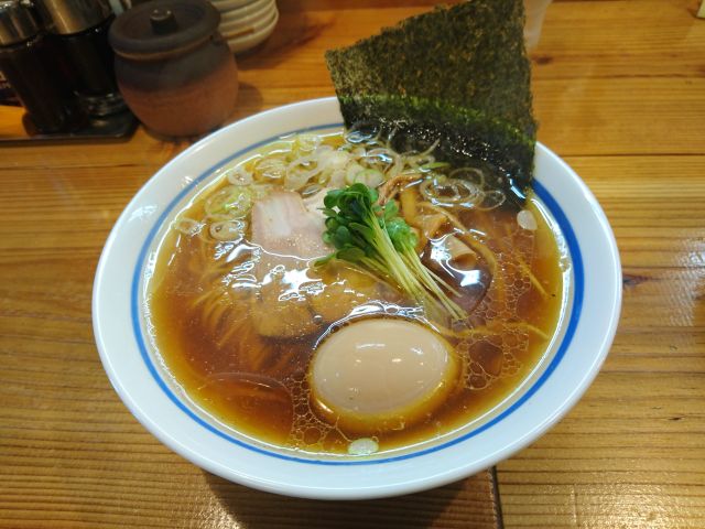 注文は一番オーソドックスな「昔ながらの中華そば 並(650円)」、待つこと6~7分で着丼、もやしと青ネギがしっかりのっています^^; スープは鶏ガラ醤油、甘みがかなり強いですね。鶏ガラと醤油のバランスはバッチリ、鶏の旨味もしっかり出ています、オープン直後ながら完成された味わいです。