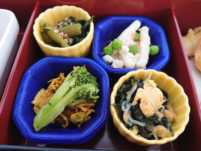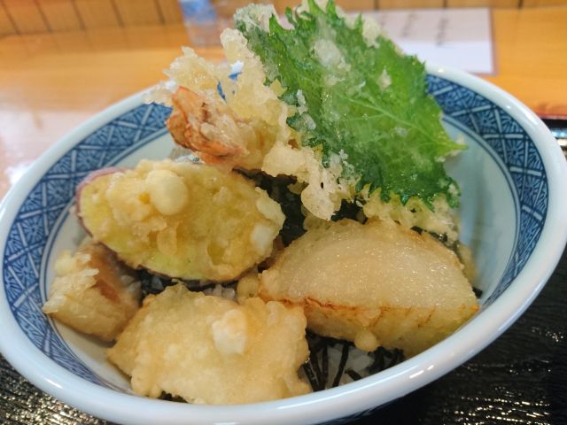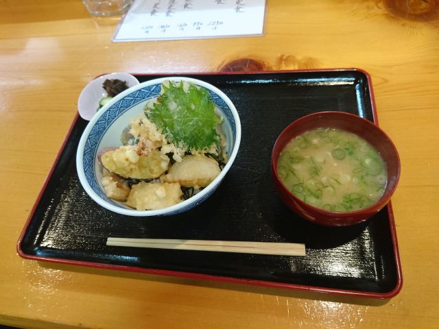 小鉢はどれもしっかり作ってありますね、健康的な素材を使用していますのでどれもご飯に合います。天ぷらは揚げたて、ちくわ・人参・さつまいも・玉ねぎのかき揚げ・焼海苔・ピーマンの6種です。