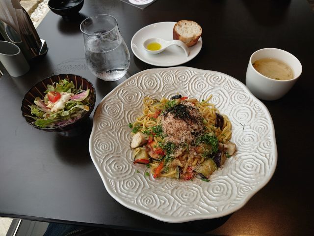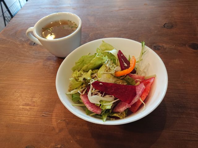 注文はオムライスセット(1054円)、最初にサラダとスープがやって来ます。サラダの量は多め、素材が大きくワイルドな印象、ワシワシ噛んで頂きます^^;