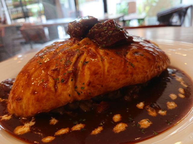 上の卵は割と硬めに仕上がっています、真ん中で切断しても崩れないですね。中のチキンライスはオーソドックスな味付けでした。ビーフシチューはじっくり煮込まれ旨味が凝縮、デミグラスソースに比べると濃い目の味わい、旨味の詰まったビーフが特に美味しかったです^^