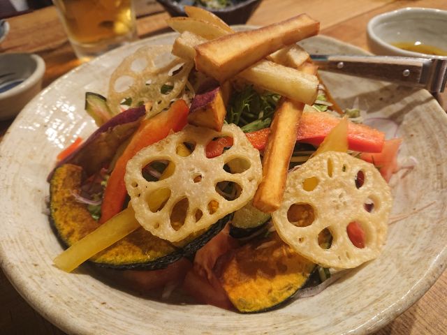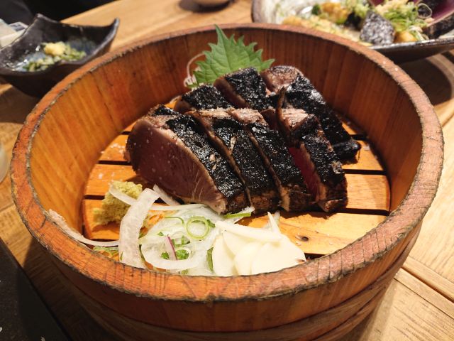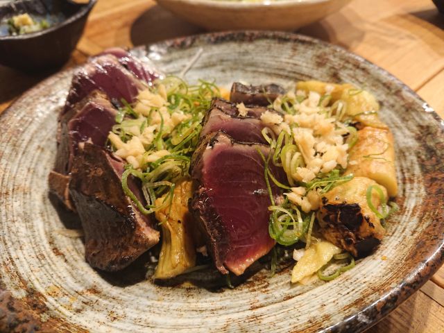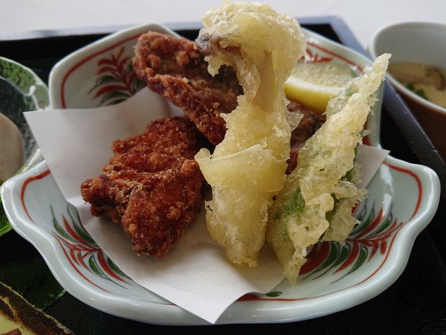 秋刀魚の竜田揚げはカラッと揚がってサクサク食感、これはビールに合うでしょう。同じ器に天ぷらも盛り付けられていました。牛ロースステーキは大根おろしがのってあっさり仕様、脂バランスが良く美味しいです。