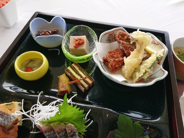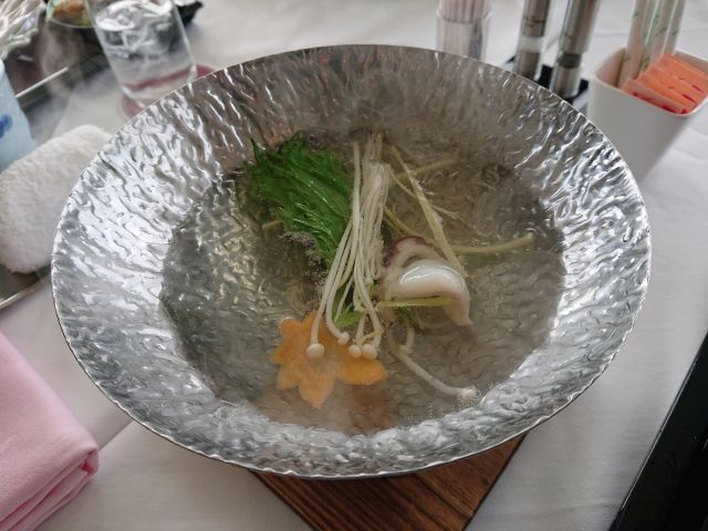 注文は「相生膳(2800円)」、待つこと10分少々で配膳、なかなか品数の多い和食膳ですね。簡易コンロでは蛸しゃぶが出来るよう銀製の鍋がセットされます。