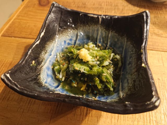 秋味前菜は4種、酒が無性に欲しくなる味わいですね、ドライバーですのでお茶で頂きます^^; 造りは2種、鰹のたたきと鮭、どちらも新鮮で美味しいです。