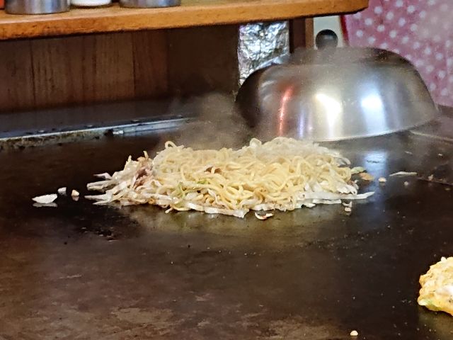 注文は焼きそば(400円)、お母さんが鉄板で丁寧に焼いてくださいます。キャベツ・豚肉は別々に炒め、途中からそばを焼き始め、中盤で合体、終盤ソースを絡め仕上げます。待つこと10分少々で完成です!