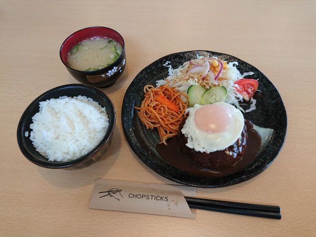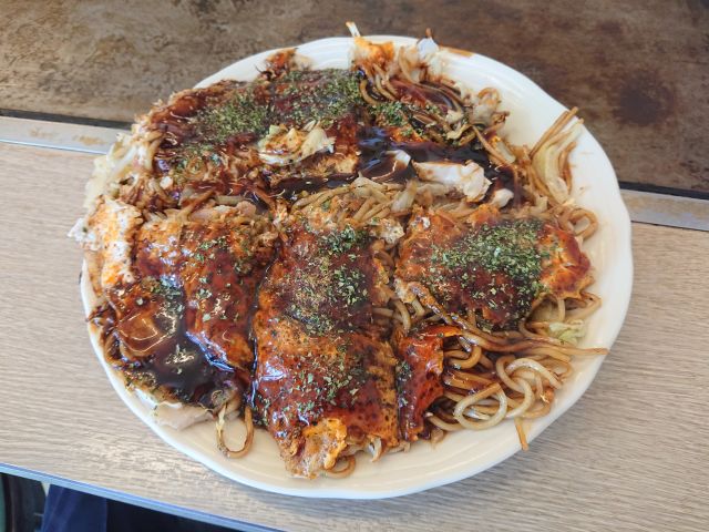 注文はそばモダン(700円)、メニュー通りに言えば「豚玉 そば」になります。鉄板で女将さんが丁寧に焼いてくださいます。待つこと10分少々完成、外気温34℃なので鉄板じゃなくお皿で頂きましょう^^