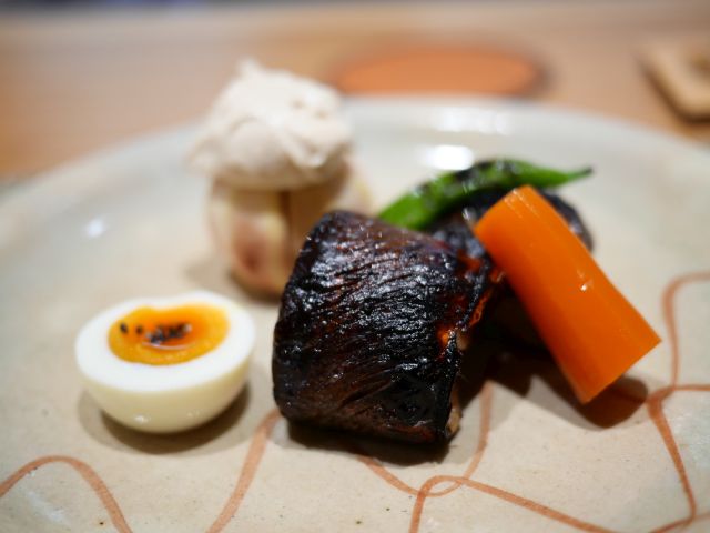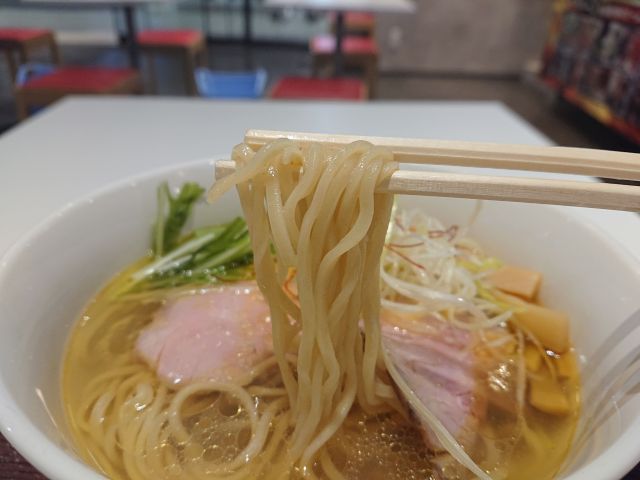 麺は中細ストレートで少しの撚れ、デフォでいい塩梅の硬さ、ツルシコ麺は塩スープに合います。レアチャーシューは2枚、こちらは本店さんで頂いた時より小さいです。他の具材はゆず・シナチク・水菜・白髪ネギ・糸唐辛子です。