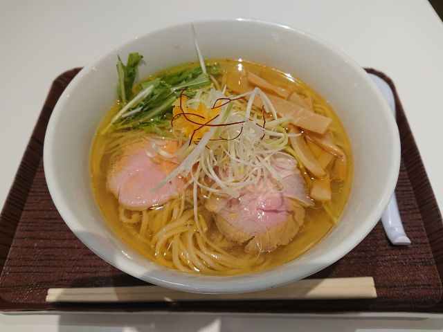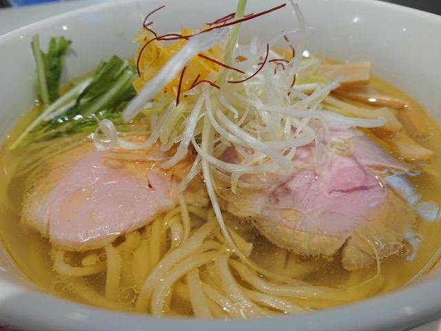 注文は鶏塩ラーメン(750円)、待つこと6~7分で着丼、綺麗な盛りつけですね^^ 透明ながらも少し黄色が掛かったスープが食欲をそそります、鶏脂は多めですが鶏の旨味が凝縮されている極上スープです。