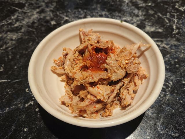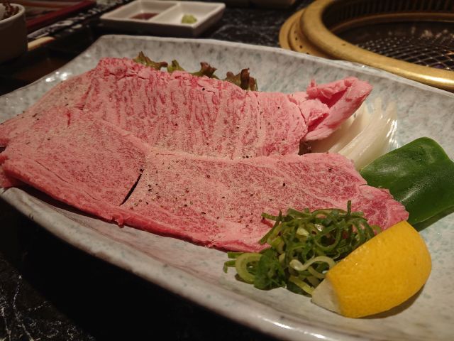 和牛はまずまずの色合い、サシが綺麗に入っていますね。それほど厚みはないのですぐに焼けます。癖のない和牛ロースは食べやすいです!。タレは3種ありますがわさび醤油が一番合うように思いました。中サイズのご飯があっという間になくなりました^^;