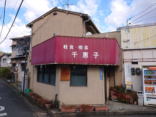 会社からほど近い大安寺東町の昭和喫茶「千恵子」さん、長らくBMしていましたがやっとこさ訪問です。赤い日除け看板が年季を物語ります。