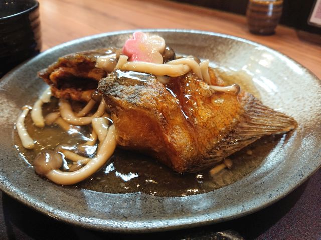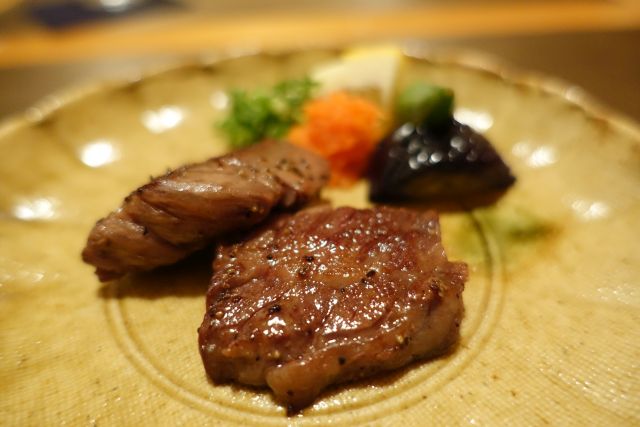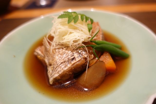 鯛は煮物で登場、野菜と一緒に焚かれていますが濃いめの味わい、旨味がしっかりです。焼き物はハラミ部、脂ののりが凄いですね。レモン汁と薬味で中和させながら頂きました。