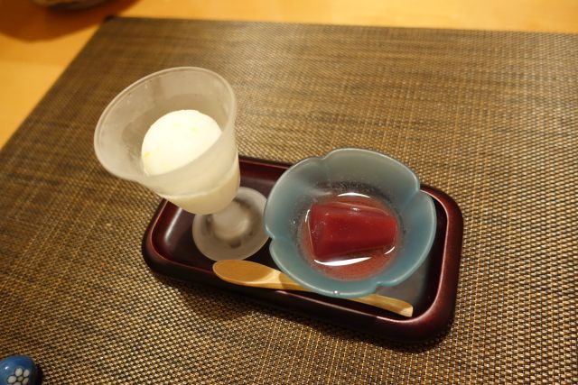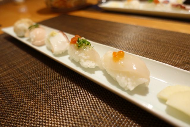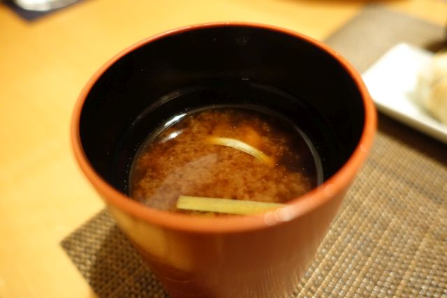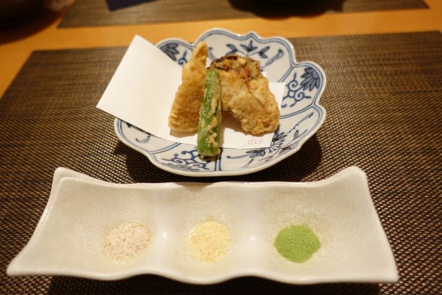 揚げ物は3種の塩で頂きます、衣が軽くサクサク食感、後半の揚げ物は少量で十分ですね。ご飯物は握り寿司、サイズは小さめですが5貫あります。酢飯は硬め、ネタはどれも一工夫されており、美味しい〆に納得です。味噌汁には造りで供されたオコゼ身が入っており贅沢な椀物になりました。