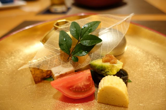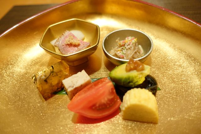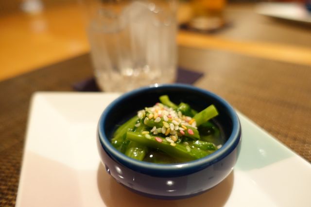 おまかせの鴨川コース、まずは焼酎ロックをお通しで頂きます、繊細なお浸しです。先附は盛りだくさんの内容、手前のトマトは総社産の有名な自然栽培品、皮が厚く昔ながらの味わい、ふぐの煮こごりは芸術品ですね、繊細淡白な旨さをしっかり閉じ込めています。小器の鴨肉は脂がのって好みの味わいです。