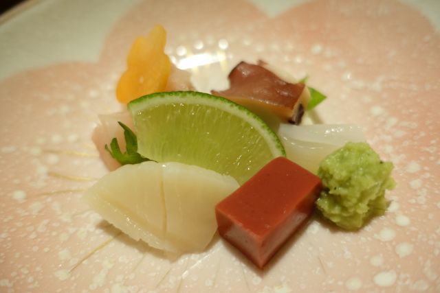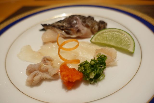 最初の造りはおこぜ、身は淡白なので薬味と一緒に頂きます。湯引きされている箇所もあり食べ比べ出来ます。奥の頭部はそのまま返して椀物の具になります。造り盛り合わせは地元産のオンパレード、どれも新鮮で酒が進みますね。タイラギと蛸の食感違いを楽しみました!