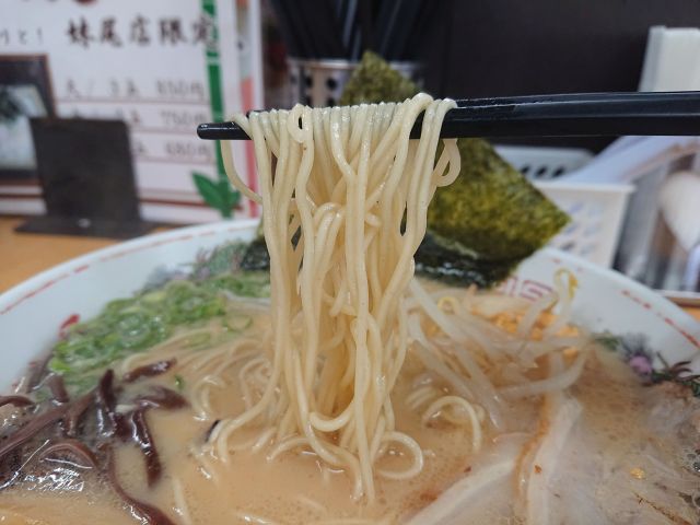 麺は細ストレート、硬めでお願いしてバッチリの硬さ。チャーシューはやわらかく、ホロホロ崩れる中サイズが2枚。他の具材は煮玉子・きくらげ・シナチク・もやし・青ネギです!