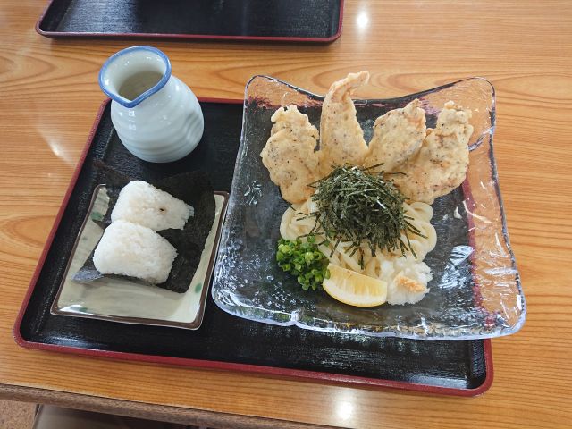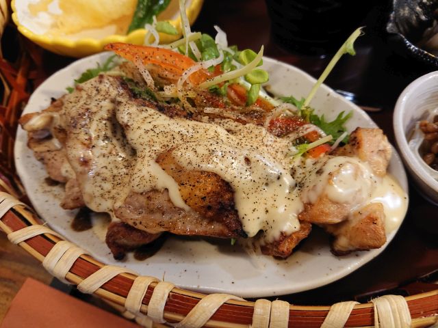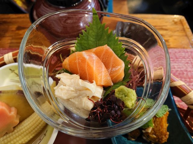 メインは鶏肉のクリーム掛け、香ばしくローストした鶏肉に濃厚なクリーム、胡椒しっかりでご飯がガッツリ進みます^^ 刺身はサーモンと湯葉、天ぷらは海老と脇役もしっかり、しめじたっぷりの揚げ出し豆腐が特に好みの味わいでした(*^^*)