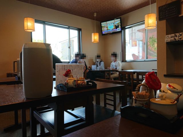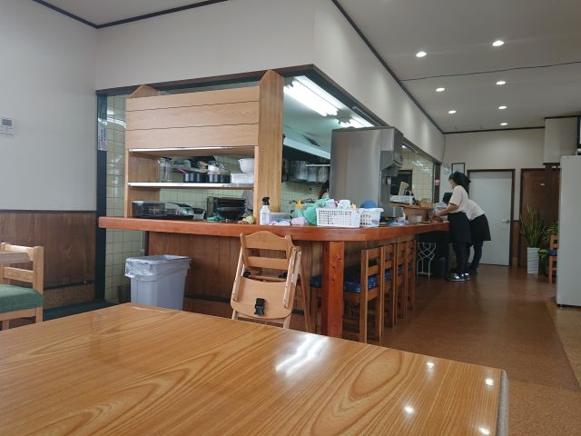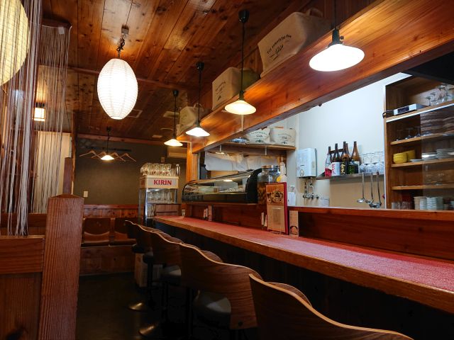 昼時はいつも賑わっている当店ですが14時頃なので閑散としています。厨房前のカウンター席と壁際のテーブル席、奥には座敷席の構成です。