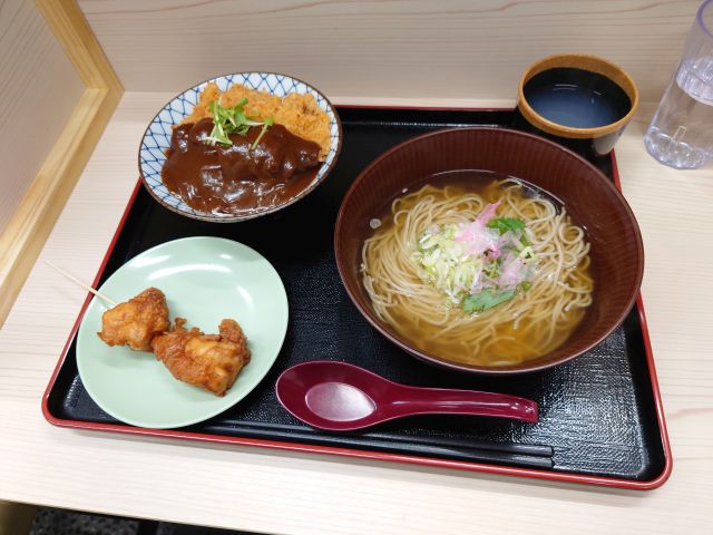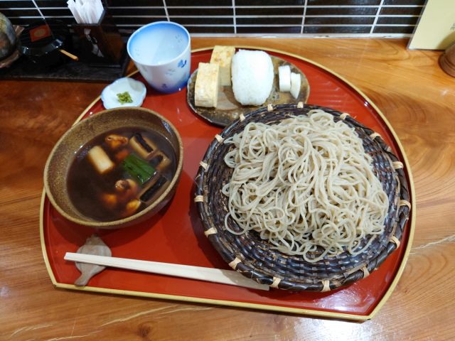 注文は「鳥南蛮つけ麺そば」+「おにぎり&だし巻き」、待つこと10分少々でやって来ました。蕎麦の盛りが良くなっていますね、大盛り級に盛り上がっています^^;