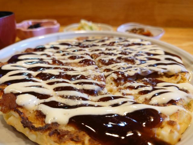 お好み焼きは関西風、中はふんわり柔らかく、両面は香ばしくこんがり、豚バラ肉もしっかり入ってご飯が進みます^^ 小鉢類やお味噌汁も好みの味わいで最後まで美味しく頂きました。