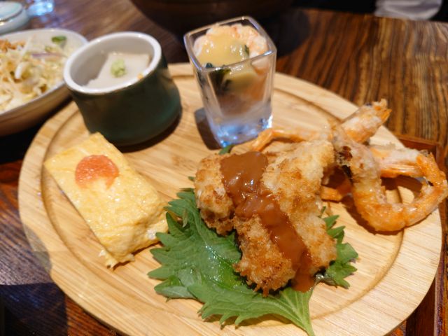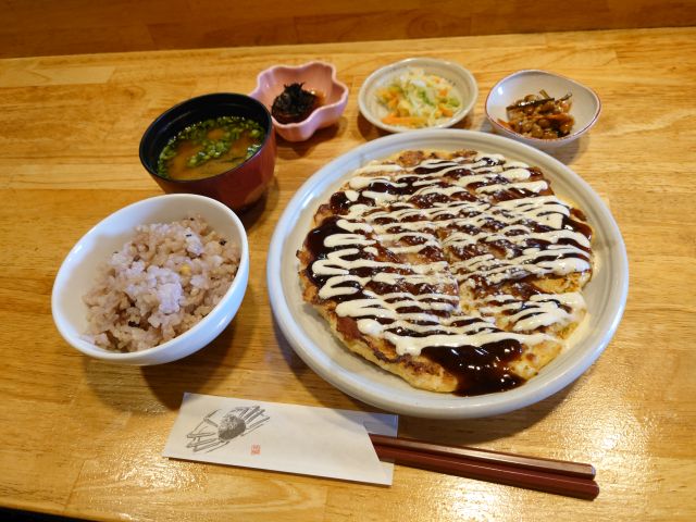 注文はお好み焼きランチ、厨房で女将さんが丁寧に焼いてくださいます。待つこと10分弱で完成、小鉢の多い健康的な構成、ご飯の代わりにサラダを選択することも出来ます!!