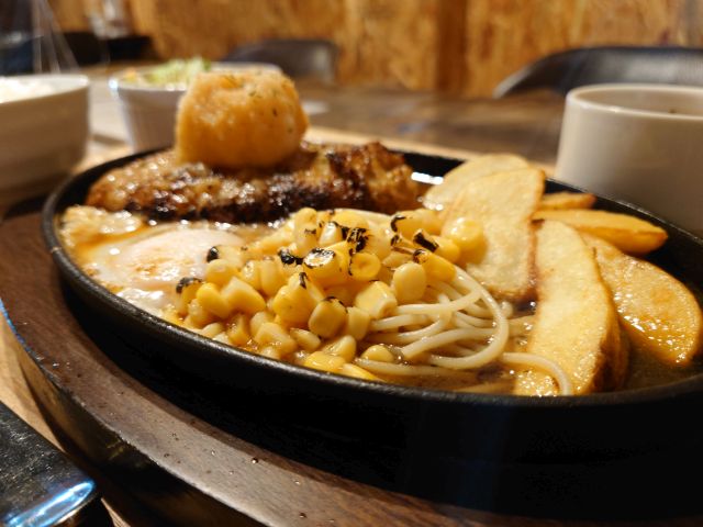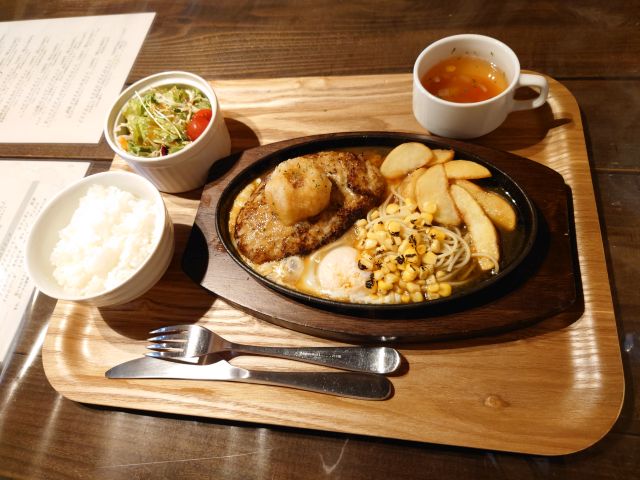 注文は「グリルハンバーグセット」、ソースは3種から選択できますので ”和風おろし”をチョイス、待つこと10分少々で配膳です。メインの他にサラダとスープ、メイン皿にはフライドポテト・スパゲッティ・コーン・目玉焼きがのっています!!