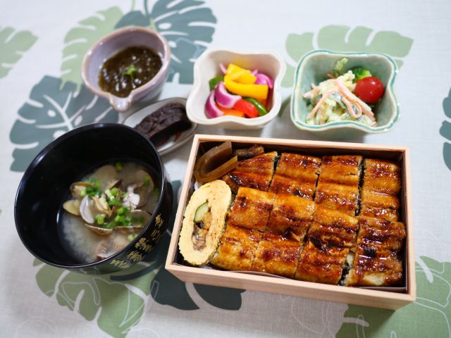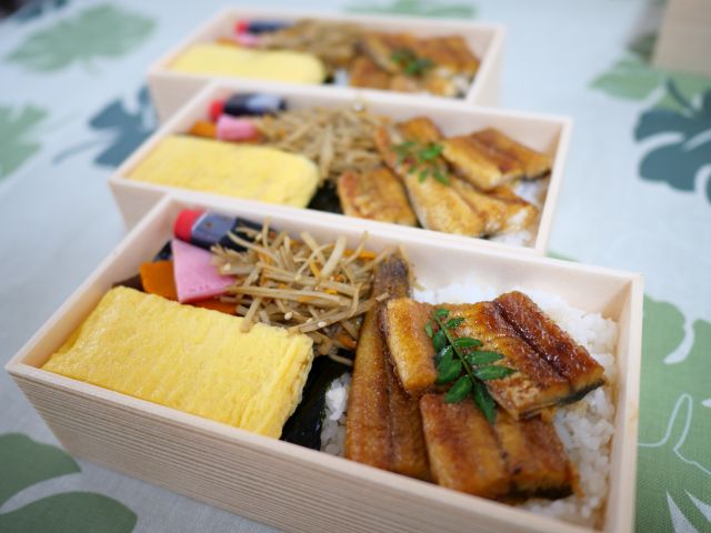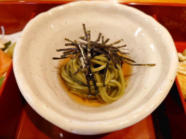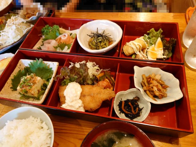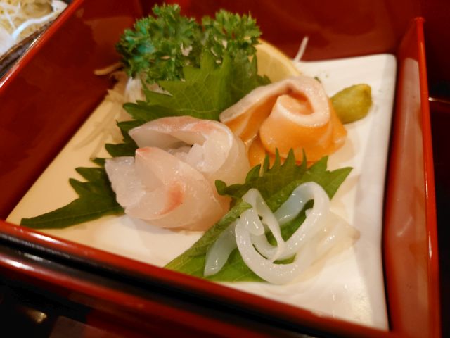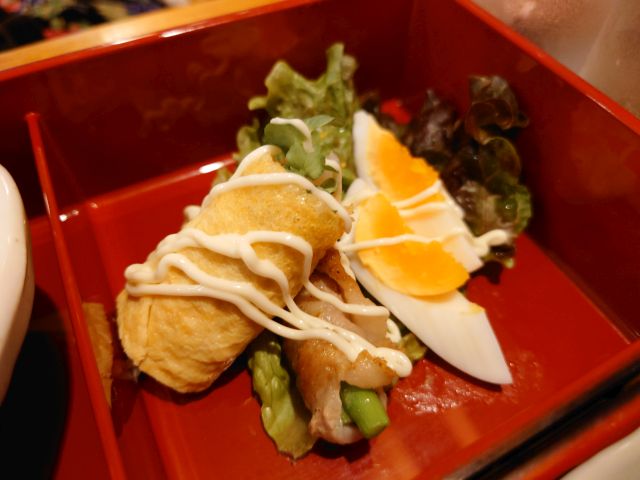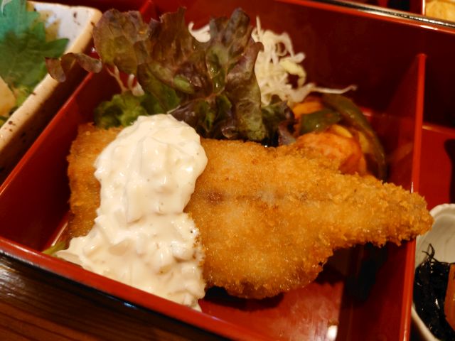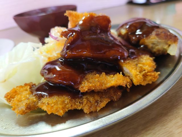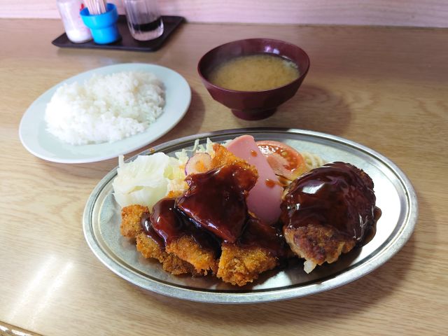 おかずは3種、ハンバーグ・一口カツ・厚みのあるハム、サラダとスパゲッティも添えられています。ハンバーグは中サイズで肉肉しい味わい、濃厚なソースが食欲を掻き立ててくれます。一口カツは薄めですが今回は4枚、厚みのあるハムと一緒にハンバーグを盛り立てます!!