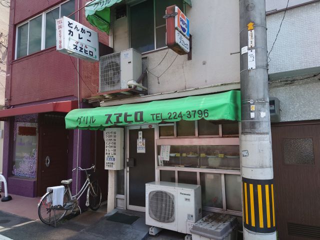猛暑日のウィークデー、遅いランチに訪れたのは富田町の「グリル スエヒロ」さん、外観が素敵な昭和食堂さんですね、日除け上部の電灯看板は激渋、7年ぶりの訪問、岡山駅からも徒歩圏内です。