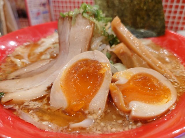 注文は「味玉味噌(880円)」、待つこと10分少々で着丼、赤丼に濃い色の味玉が映えますね!。スープは濃い目の辛口味噌スープ、塩分濃度は高めの印象、白ごまがしっかり入っていました。